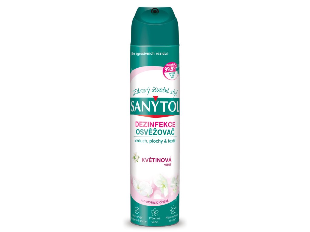 Sanytol Dezinfekční osvěžovač vzduchu, povrchů a textilií vyčistí vzduch a vydezinfikuje povrchy v jednom jediném kroku. Zahubí 99,9 % bakterií, plísní a virů, včetně viru chřipky typu A (H1N1) a lidského koronaviru 229E. Dezinfikuje, čistí, neutralizuje a ničí zápach. Zanechává příjemnou vůni. Ideální na čištění vzduchu ve velmi navštěvovaných nebo v málo větraných místech (tabákové pachy, zatuchlina, pachy v kuchyni, na toaletách, ve skříni, v autě) i na dezinfekci povrchů (koberce, závěsy, matrace, polštáře, autosedačky, kliky, počítače, telefony, nádoby na odpadky, vypínače, záchodové mísy). Doporučován pro preventivní použití nebo v období epidemie (chřipka, gastroenteritida, ... ). Nezanechává skvrny, k textiliím je šetrný. Příjemně provoní celou domácnost jemnou vůní květin. Bez chlóru.